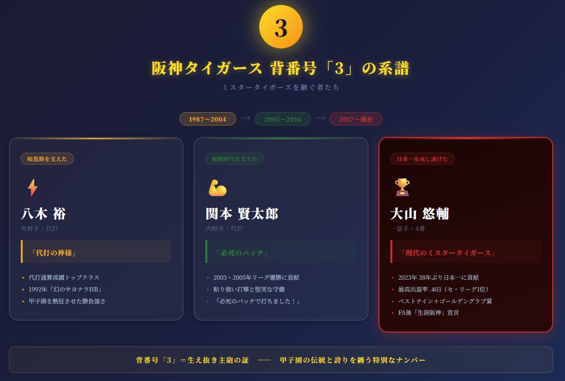阪神タイガースの歴代の歴史においても、背番号3は「勝負強い和製大砲」や「ファンから愛される生え抜き選手」が背負う特別な指定席として扱われてきました。