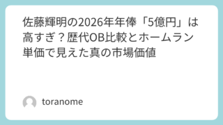 年棒 佐藤輝明の2026年年俸「5億円」は高すぎ?歴代OB比較とホームラン単価で見えた真の市場価値 阪神タイガースの主砲、佐藤輝明選手が2026年度の契約を更改しました。12球団最後の大トリとなった今回の更改、その驚愕の内容をまずは表でチェックしましょう。【2026年度】佐藤輝明 契約更改サマリー項目内容備考推定年俸4億5,000万円前年... 年棒